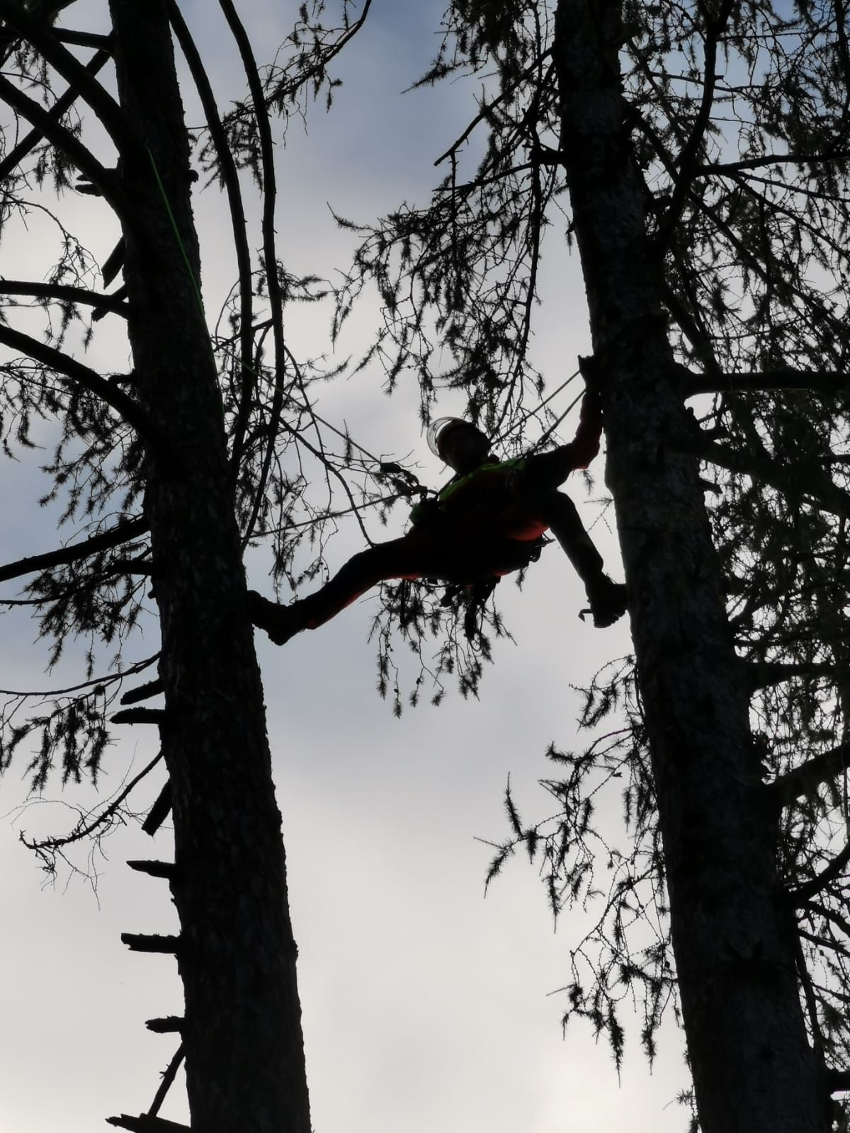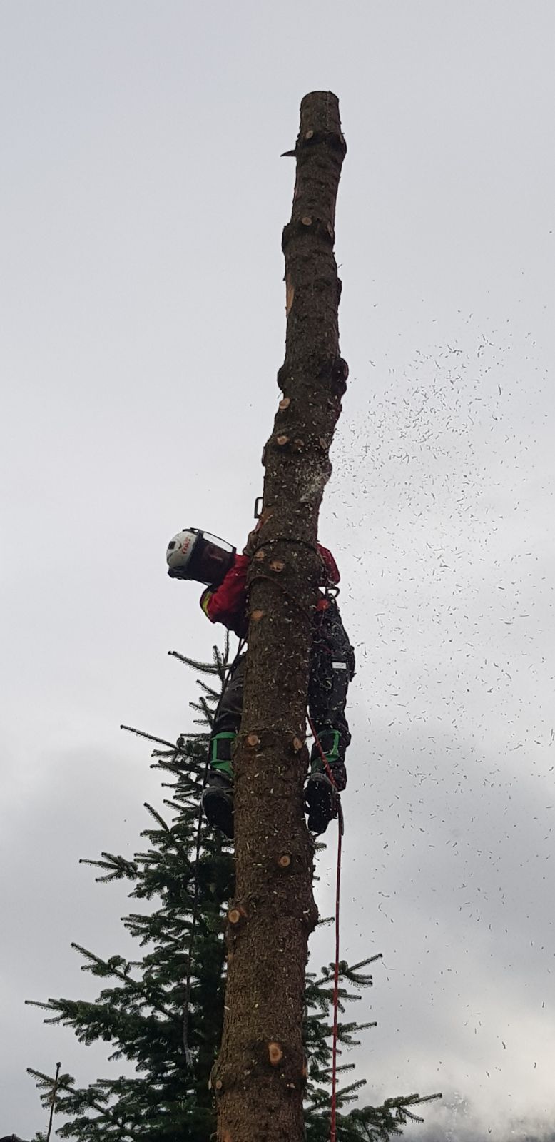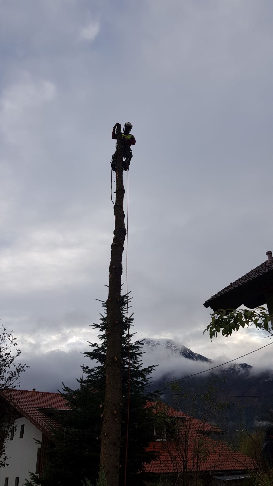 Meine Expertise in der Höhensicherung kommt mir auch bei der Baumabtragung zugute. Zunächst wird geprüft, ob der Baum durch Pflegemaßnahmen nicht noch gerettet werden kann. Ist dem nicht so, folgt als erster Schritt die Einsatzplanung, die stark vom Gelände abhängt. Vor der Fällung wird der Gefahrenbereich abgesichert. Bei der Abtragung selbst arbeite ich mit Seilklettertechnik oder Hebebühne und Motorsäge. Ist eine Fällung in einem Stück wegen Platzmangel nicht möglich, so werden Stücke abgeworfen, abgeseilt oder mittels Kran herausgehoben.